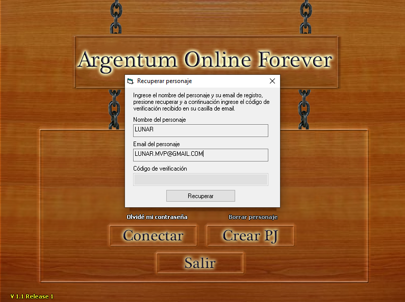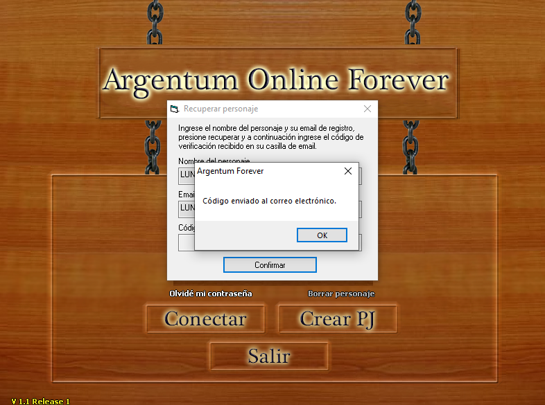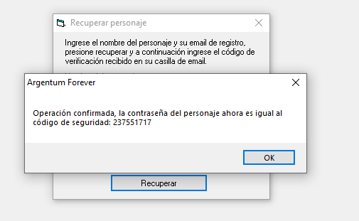 4) Copiamos el código de verificación que nos llegó al correo y lo ingresamos en el formulario de recuperación de clave, si el código proporcionado coincide con el que se envió al correo entonces ese código pasará a ser la nueva contraseña del personaje y recibirán un mensaje como este: